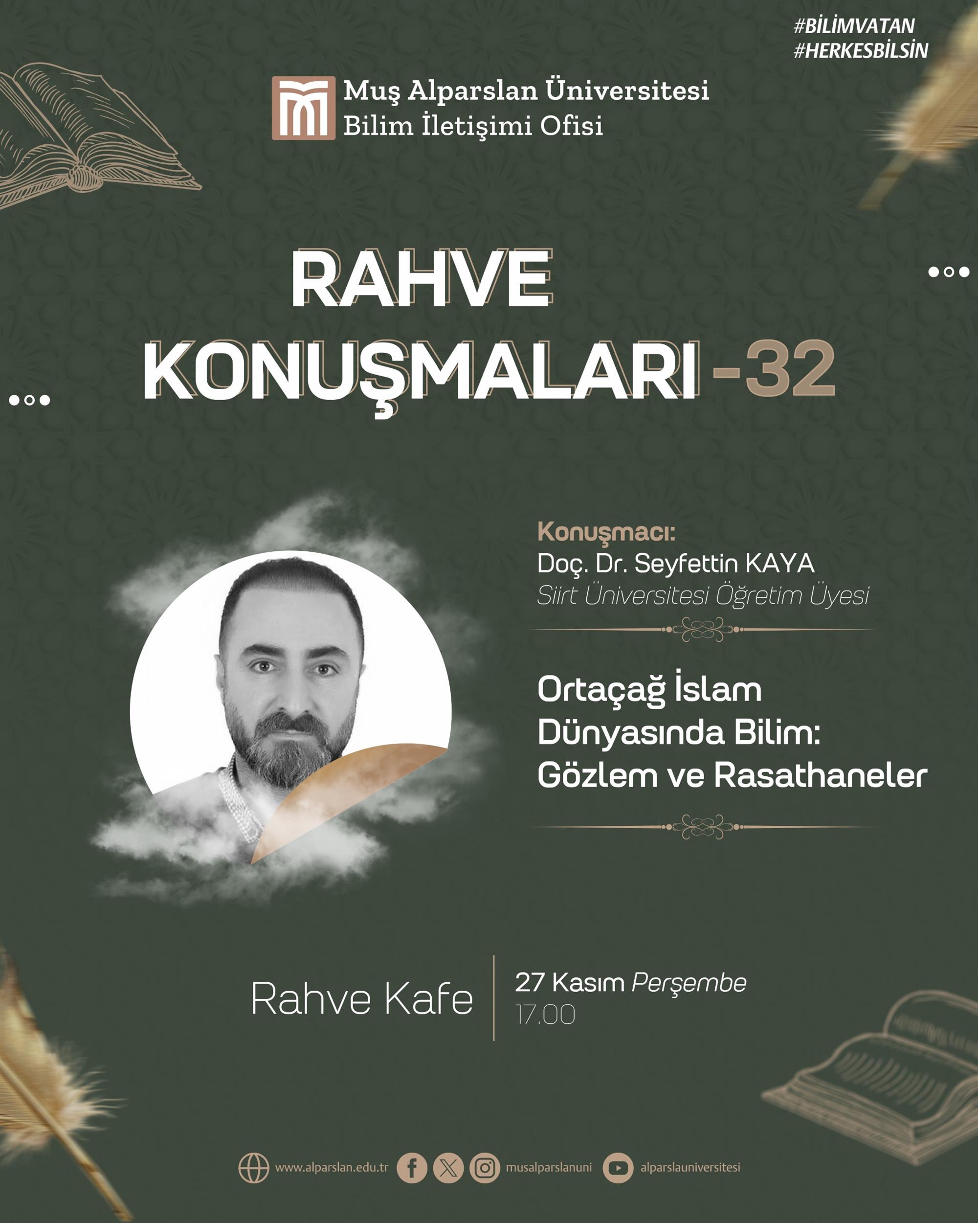 Bölümümüz öğretim üyelerinden Doç. Dr. Seyfettin KAYA, Muş Üniversitesi ev sahiplğinde "Rahve Konuşmaları-32" de "Orta Çağ Dünyasında Bilim: Gözlem ve Rasthaneler" adlı söyleşi gerçekleştirdi.
